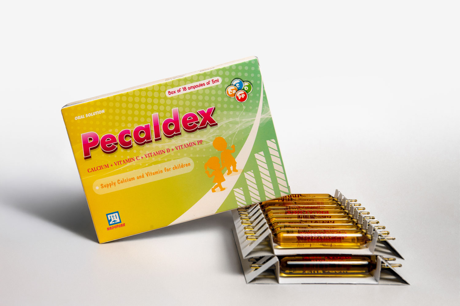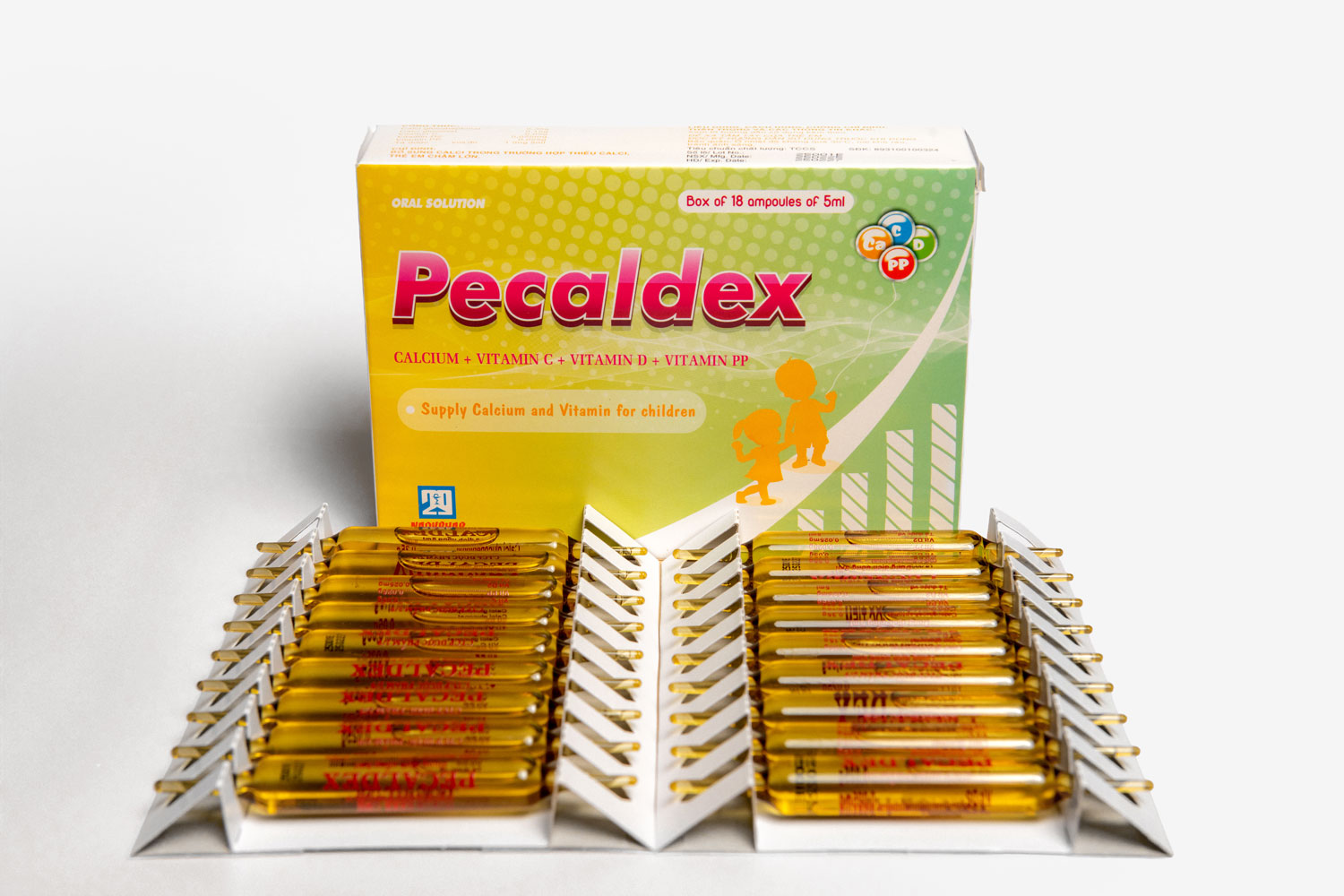 Ống 5ml: Calci glucoheptonat 0,35g; Calci gluconat 0,15g, Vitamin C 0,05g, Vitamin D₂ 0,025mg, Vitamin PP 0,025g